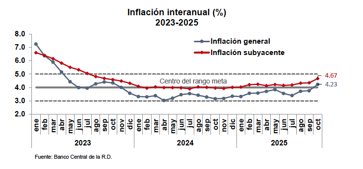 El Banco Central de la República Dominicana informa que el índice de precios al consumidor (IPC) registró una variación mensual de 0.55 % en octubre 2025, situando la inflación interanual medida de octubre 2024 a octubre 2025 en 4.23 %. Cabe destacar que la inflación ha permanecido dentro del rango meta de 4.0 % ± 1.0 % por 30 meses consecutivos, es decir, durante los dos años y medio transcurridos desde mayo de 2023 hasta la fecha.