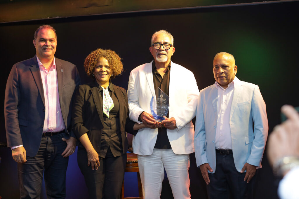 Charlie Mosquea recibió una placa de reconocimiento por parte de SGACEDOM, representado por su presidente en ese entonces, Daniel Valerio (primero a la derecha). Acompañan, Máximo Jiménez, y la presidenta de Acroarte, Marivell Contreras.