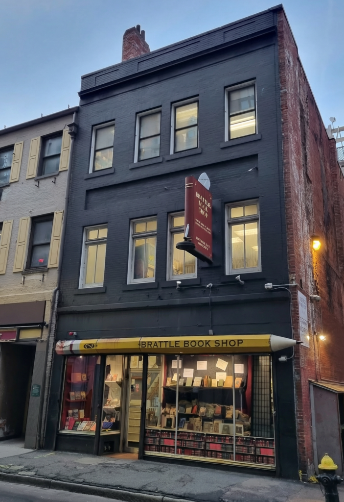 La vi desde la acera de enfrente. El edificio se alzaba con una sobriedad casi obstinada, sin ansiedad por vender, pero con una clara vocación de acogida. La fachada, de ladrillos pintados de un negro cansado, mostraba ventanas que, con dignidad, invitaban a la calidez de su interior. Sobre el escaparate, un lápiz amarillo con la goma mordida anunciaba el nombre; más arriba, colgando junto a las ventanas del segundo nivel, un enorme libro reafirmaba que ahí estaba la Brattle Book Shop.