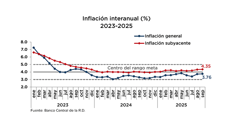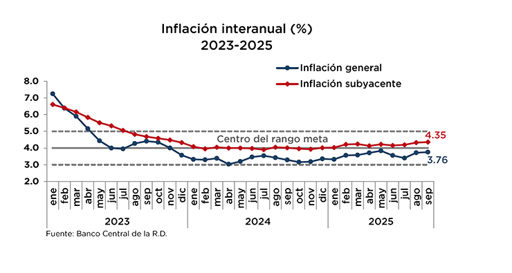 El Banco Central informó este martes que el índice de precios al consumidor (IPC) registró una variación mensual de 0.34 % en septiembre 2025. Con este resultado, la inflación interanual medida desde septiembre de 2024 hasta septiembre de 2025 se ubicó en 3.76 %. Cabe destacar que la inflación se ha mantenido por 29 meses dentro del rango meta del Programa Monetario de 4.0 % ± 1.0 %, es decir desde mayo de 2023 y se encuentra entre las más bajas de las economías no dolarizadas de América Latina.