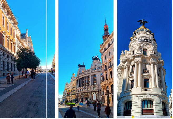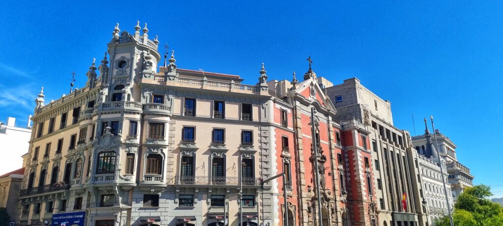 La calle Alcalá se abre ante nosotros con más 600 números siendo la calle más larga de Madrid, con teatros: columnas, cúpulas, estatuas y ese aire de antigua capital de imperio que ahora convive con turistas comiendo helado a las diez de la mañana, a la vez que disfrutan de su historia y cultura. Pasamos frente al Four Seasons Hotel Madrid, ese templo del lujo que antes fue el edificio del Banco Español de Crédito.