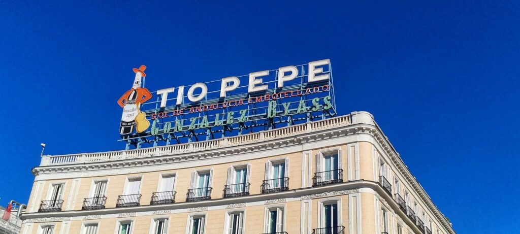 «Y mientras los pájaros visitan al psiquiatra», según Joaquín Sabina, a mi lado, el sonido del obturador hace un «clic», un turista estadounidense, bien relajado, levantó la cámara y preguntó si el Tío Pepe era una especie de santo local. Nadie respondió. Yo le dije, aunque por el día no destelle su aureola de neón, él es, el patrono del optimismo luminoso de la puerta del sol. Dice Javier: –Parece que al guiri, ¡se le ha subido el tomillo a la cabeza!», y echamos todos a reír.