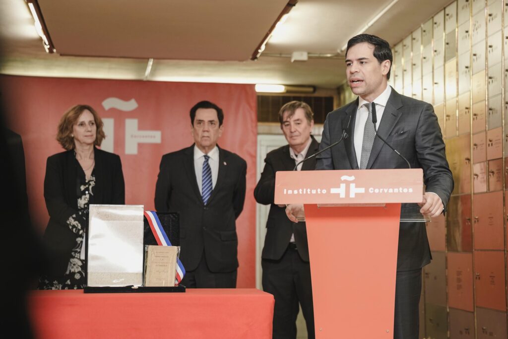 Madrid, España.– El ministro de Cultura de la República Dominicana, Roberto Ángel Salcedo, encabezó hoy el acto de aportación al acervo bibliográfico de la Caja 1535 de la «Caja de las Letras», en el Instituto Cervantes, en un gesto que reafirma la memoria literaria y humanística del país caribeño en el corazón de la lengua española.