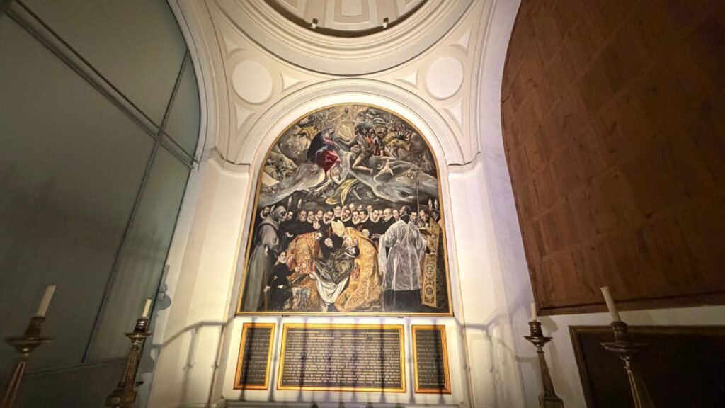 Un poco más adelante, el recorrido llevó a uno de los puntos más conocidos de Toledo: El entierro del Conde de Orgaz, la obra de El Greco ubicada en la iglesia de Santo Tomé. Es una pintura que muchos reconocen, pero verla en persona cambia la experiencia. Representa el momento en que dos santos descienden para enterrar a un noble, combinando en una misma escena el mundo terrenal y el celestial.