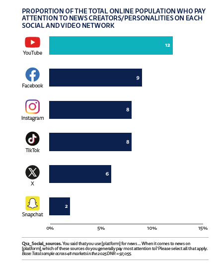 En cuanto al uso de plataformas, las dinámicas son igualmente claras. X y YouTube concentran a los comentaristas políticos, mientras que Instagram, TikTok y YouTube son el terreno natural de quienes explican o contextualizan las noticias. Esto responde, en buena medida, a la composición generacional: los públicos jóvenes buscan narrativas visuales, ágiles y con un tono más cercano. Sin embargo, las excepciones abundan. En India, Indonesia y América Latina, por ejemplo, Instagram se ha convertido en un espacio clave para el debate político, mientras que Facebook mantiene su relevancia informativa en Filipinas y Tailandia.